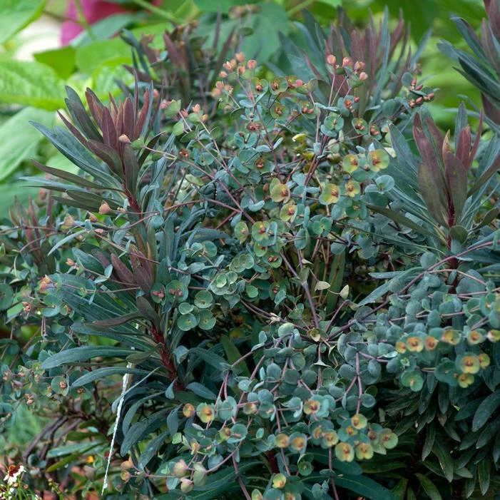Buy Blackbird Euphorbia online. ‘Blackbird’ is a compact, bushy plant with dark purple, evergreen foliage with red stems and large green blooms. Foliage will darken in full sun.