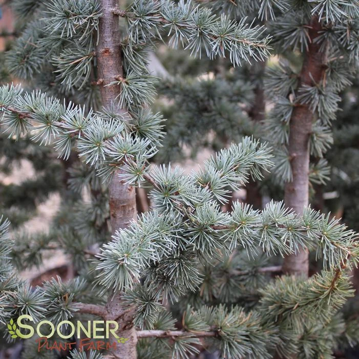 Buy Blue Atlas Cedar online. Definite specimen use, this tree makes a statement all by itself, With powder blue, somewhat silver needles and a pyramidal shape when young, becoming flat-topped with horizontal spreading branching when older.