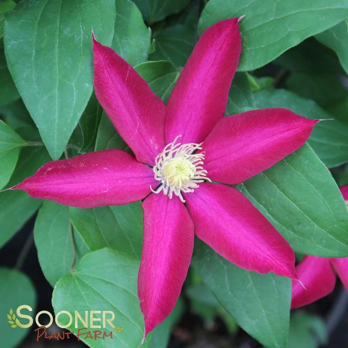Buy Bourbon™ Clematis online. This Evison/Poulsen cultivar has beautiful, large, red flowers. The bright yellow anthers provide a wonderful stark contrast against the petals. Bourbon™ Clematis is an ideal specimen for a small trellis or small spaces. Blooms June through early August.