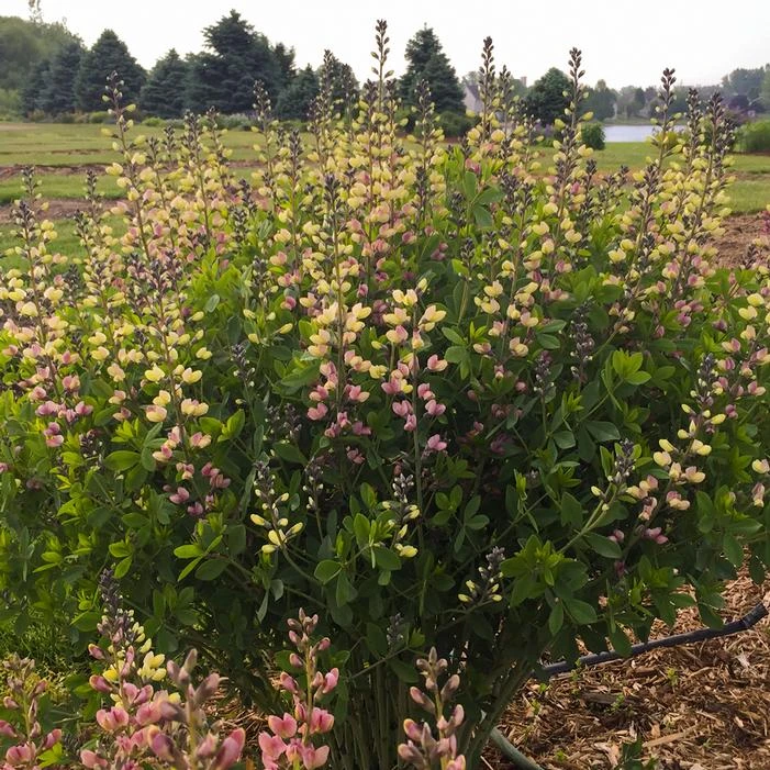 Buy Decadence® Deluxe Pink Lemonade False Indigo online. Decadence® Deluxe Pink Lemonade features soft yellow flowers that appear on the top of a compact clump of deep blue-green foliage in spring. The flowers age to dusty raspberry purple, showing both colors at the same time. It grows best in full sun and average to poor, well-drained soil. Moderately drought tolerant once established. Very long-lived perennial.