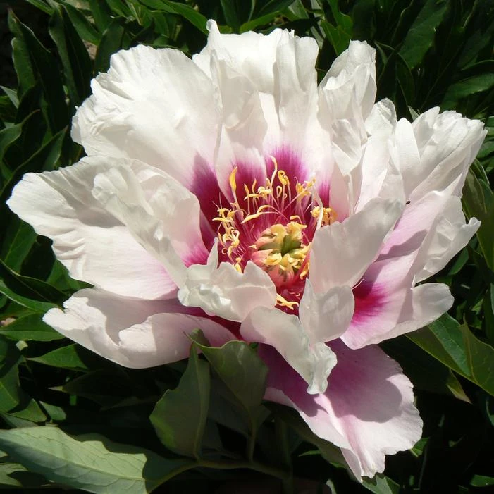 Buy Raggedy Ann Itoh Intersectional Peony online. This itoh peony produces pure white ruffled and lacy flowers that darken to purplish-red centers in mid to late spring. Each petal is deeply dissected which creates a wonderful texture in the garden. The leaves emerge red in color and fade to green as the season progresses. It’s definitely a unique perennial that will add much interest!