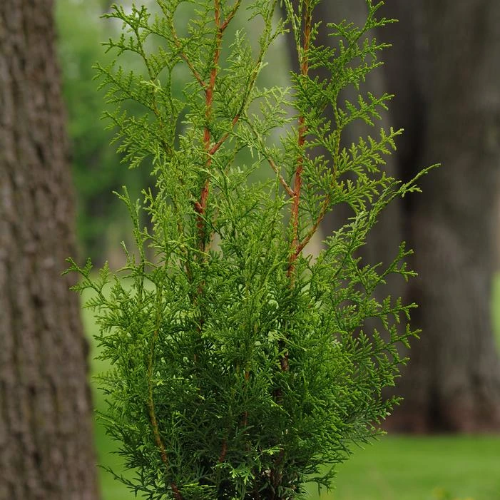 Buy Sugar and Spice Arborvitae online. Narrow-growing, upright variety has very tiny leaves for a soft texture. The contrast between brown-orange stems and green foliage is very attractive.