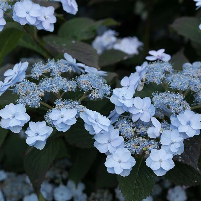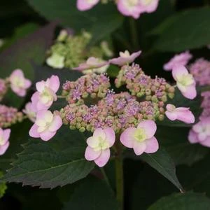 Buy Tiny Tuff Stuff™ Hydrangea online. Tiny Tuff Stuff™ Hydrangea is a real beauty, with flowers so delicate and refined that it seems strange to call them tough – but they are. Extremely bud-hardy, each year it produces abundant lacecap flowers comprised of doubled sepals; and it is a rebloomer. While this plant leans to blue, the flower color may range from blue to pink to white, all soft, delicate shades perfect for refined gardens. The flowers age to an attractive pink, and tip down in a distinctive arching fashion.